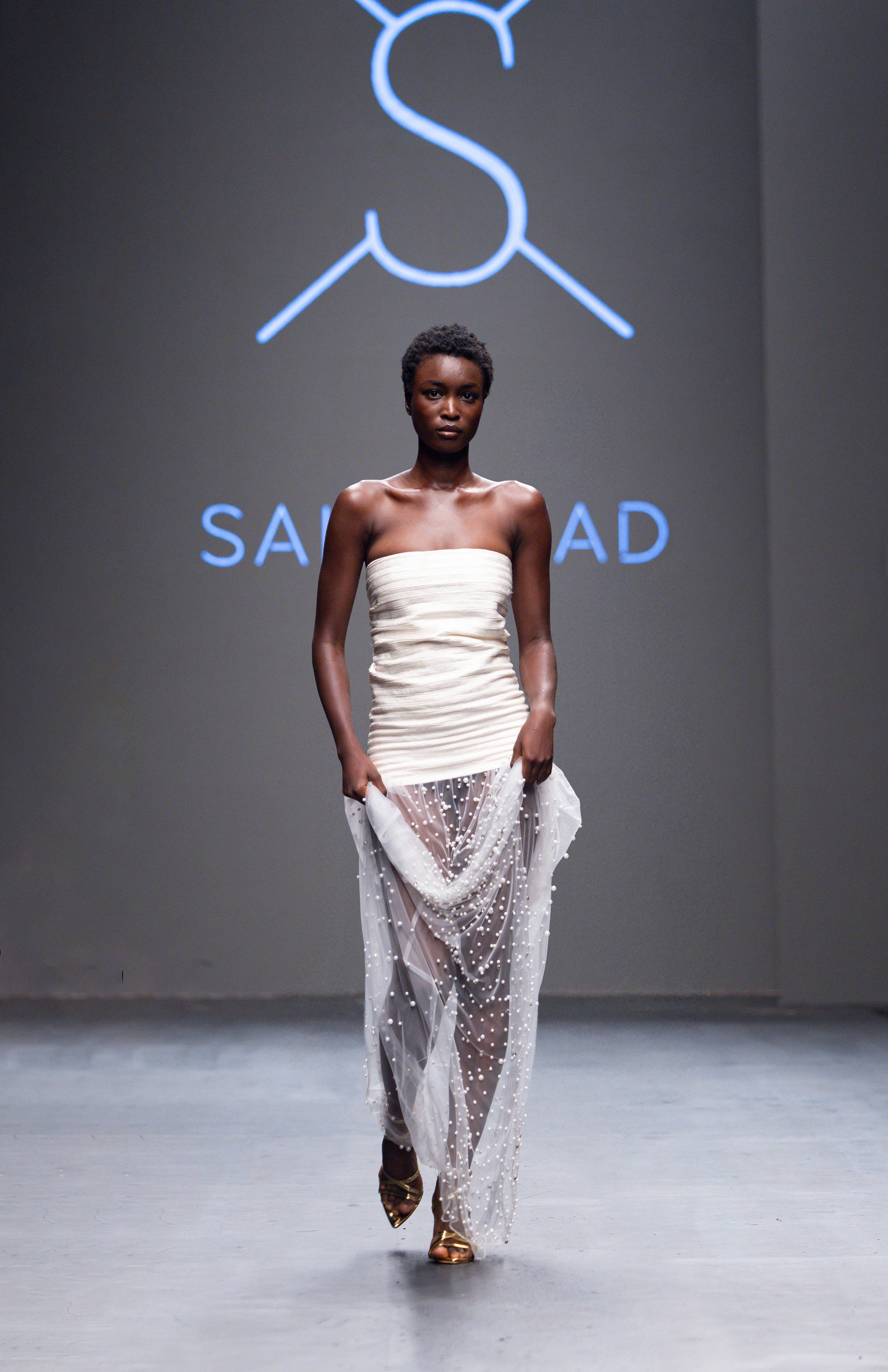 Embody the spirit of refined African elegance with Safara, a gown that seamlessly marries traditional Moroccan craftsmanship with ethereal modern design. The handwoven Sfifa bodice reflects exquisite artisanal skill, while the flowing tulle skirt, sprinkled with delicate pearls, evokes soft, graceful movement reminiscent of a gentle breeze across the Sahara.